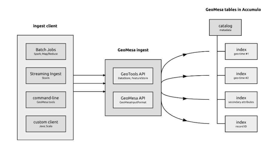 Multiple frameworks may be used for streaming and batch ingestion of data. These include the GeoMesa command line tools, map-reduce jobs with Apache Hadoop, and real-time topologies running on Apache Storm. The following diagram shows one possible ingest architecture: