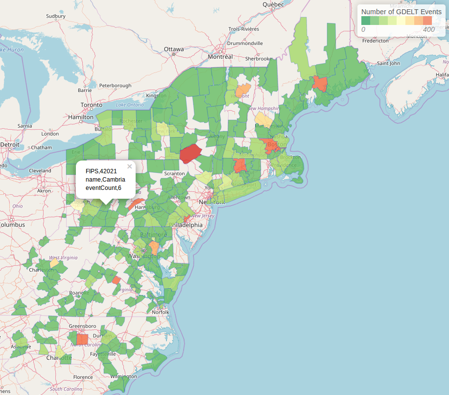 The above query groups the data based on FIPS code, (which is split into a state and county code), and counts the number of distinct GDELT events in each one. The result can be used to generate a visualization of the event density in each county, which we will see in the next section.
