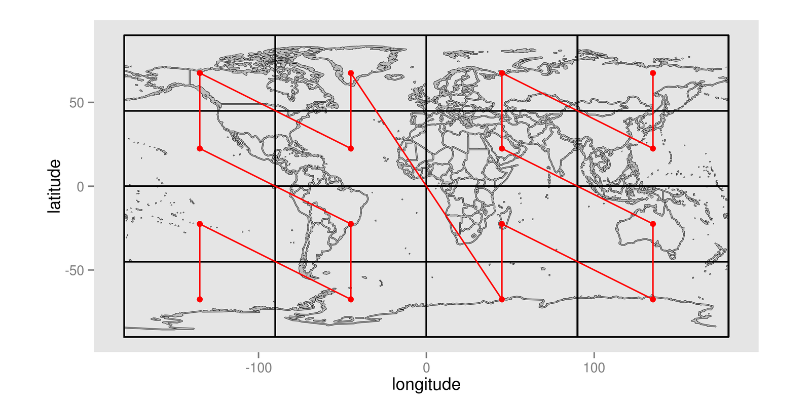 This red line is known as a space-filling curve, or to be more specific, a Z-Curve. This line visits each cell exactly once, establishing a unique ordering of cells.